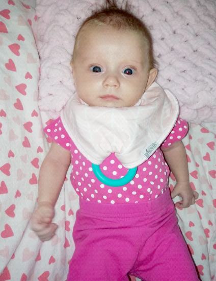 Úžasné je, že hryzadlo sa dá pripojiť k podbradníku a nikde sa nestratí. Ďalšie plus je, že sa dá znova vyvariť, takže sa z neho vlastne stáva nezničiteľná vec. A materiál je tiež parádny, uvidíme, až Amy začnú liezť zúbky, či hryzadlo zvládne nátlak kúsancov.